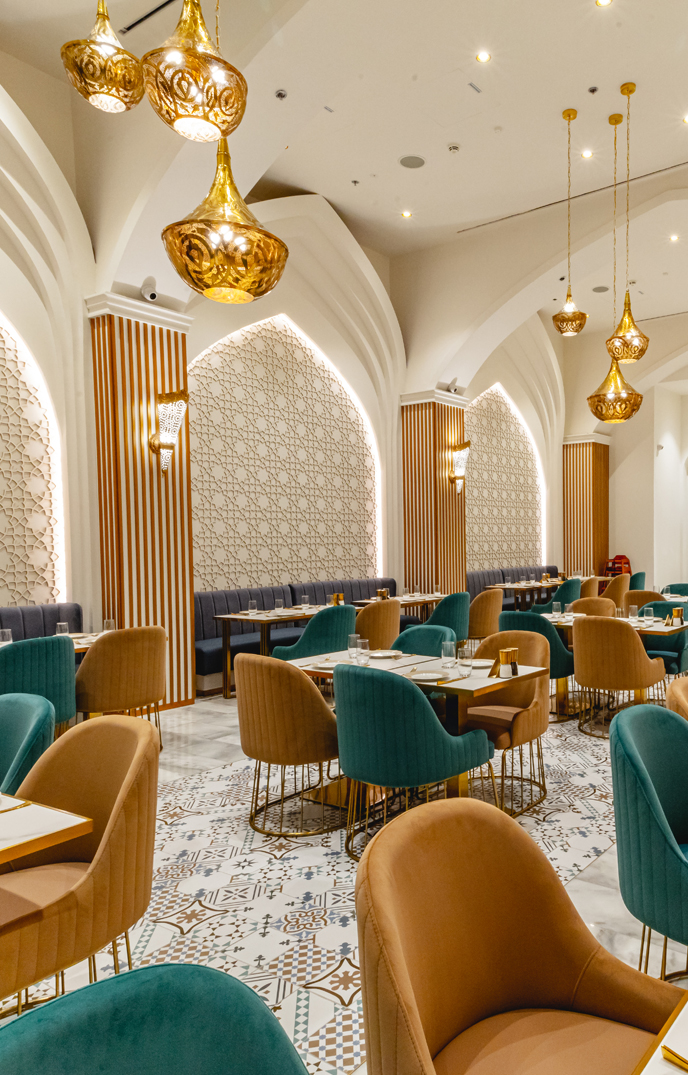 Located at Mirdif City Center in Dubai, Amazigh restaurant offers a captivating blend of traditional Moroccan cuisine and contemporary design apanning 3,000 sq. ft. We were entrusted with bringing the restaurant’s unique vision to life through bespoke wall and ceiling gypsum decorative elements and intricate arches.